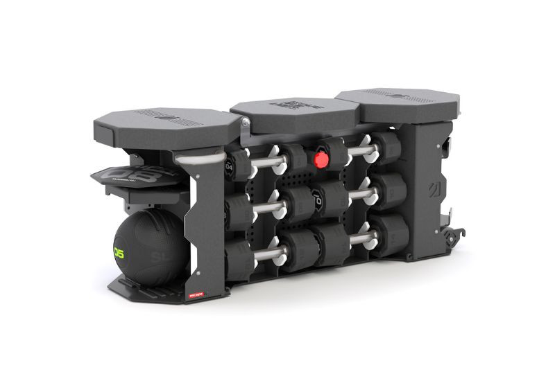 Integrated ABS plastic covers on rack shelving to protect and store up to six pairs of Escape dumbbells.