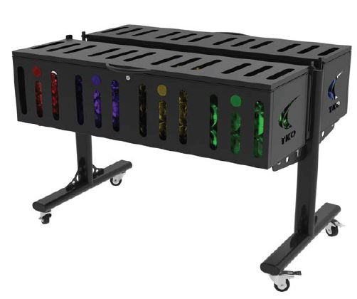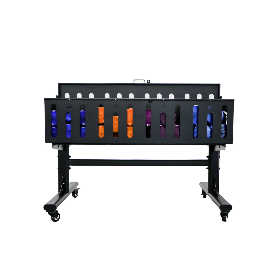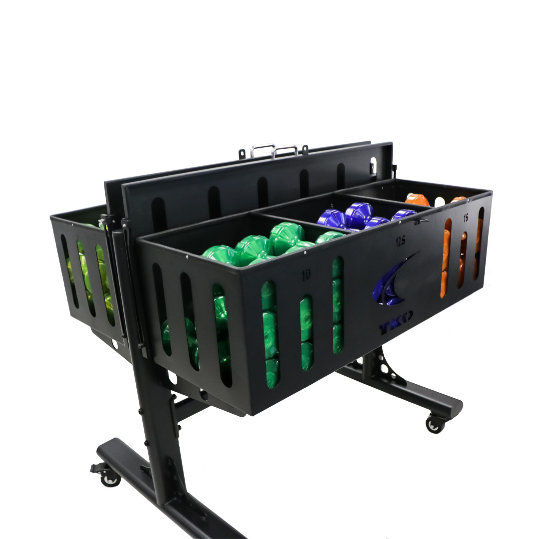 Dumbbells can be purchased in pairs, or complete with secure and portable bins.